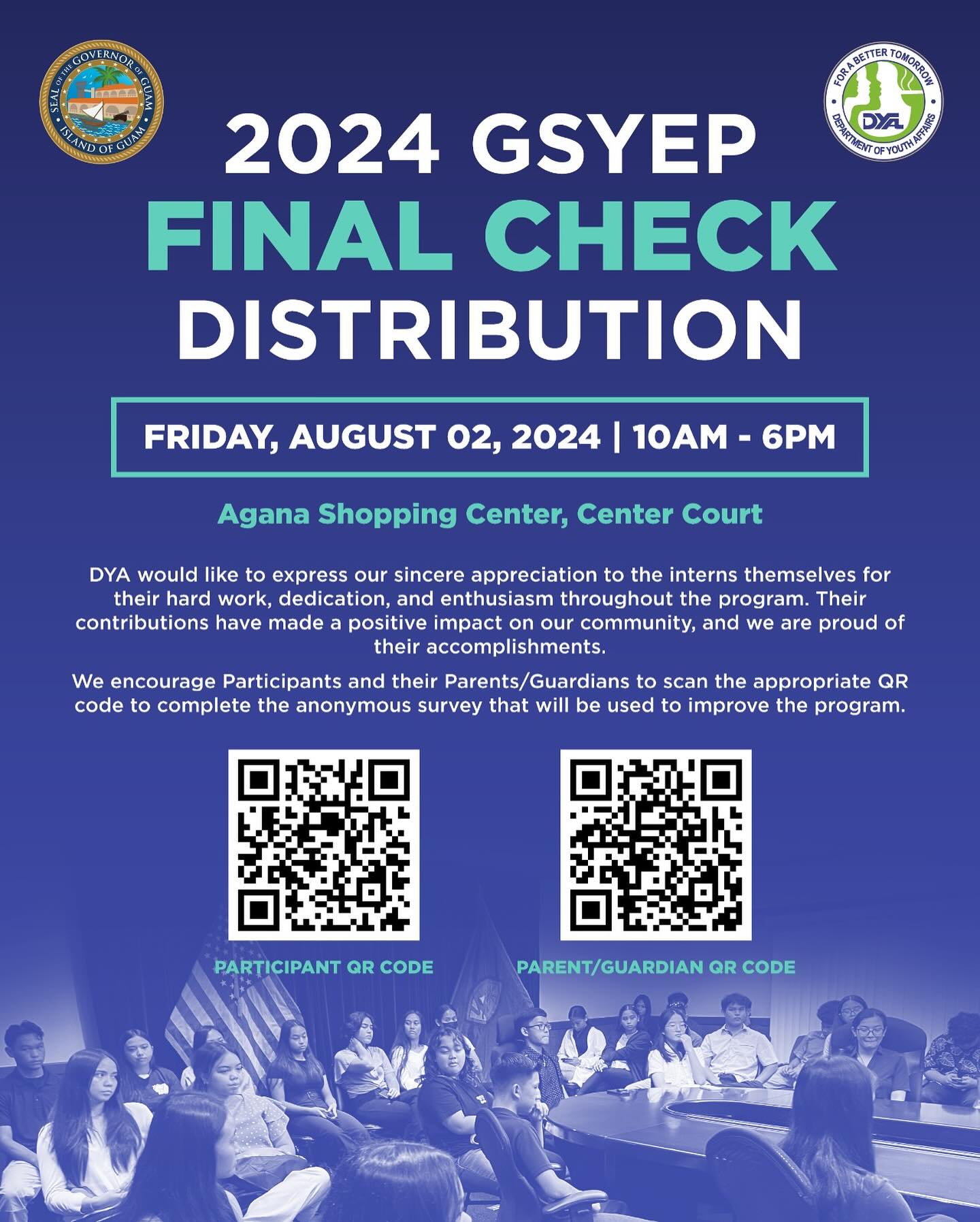 The Department of Youth Affairs will be distributing the last paychecks for all Governor’s Summer Youth Employees on Friday, August 2, 2024 from 10am to 6pm at Agana Shopping Center’s Center Court.