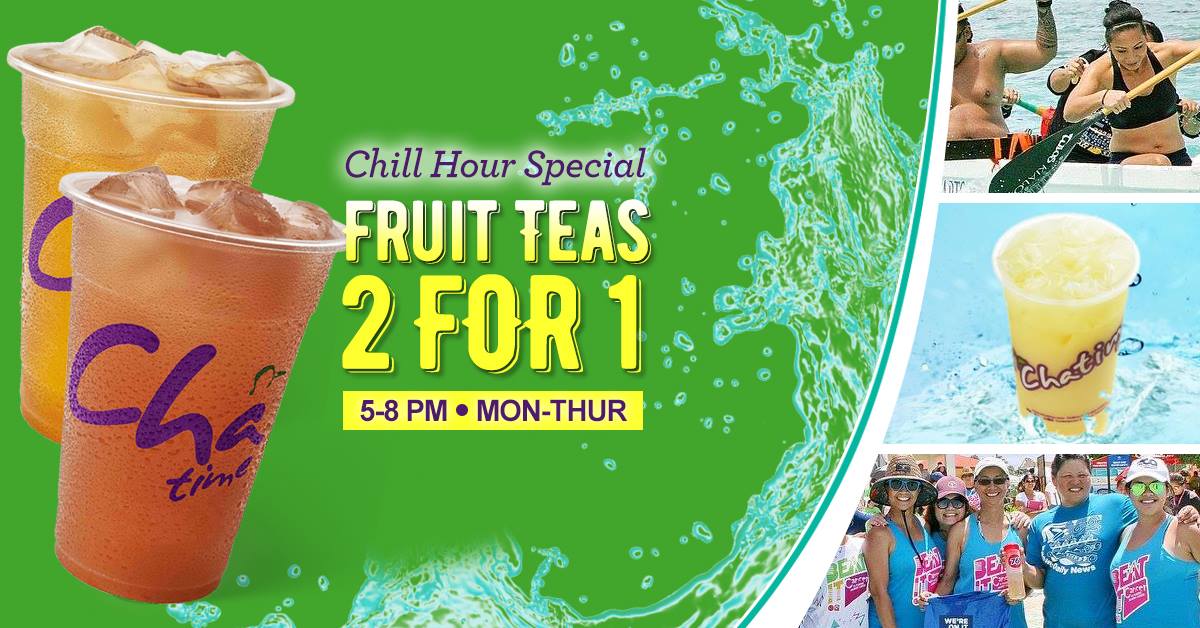 Fruit Teas are 2 for 1 at Chatime’s Chill Hour! Buy 1 Fruit Tea, get 1 FREE. MON-THUR, 5-8 PM. Just show us this offer on your phone at checkout.