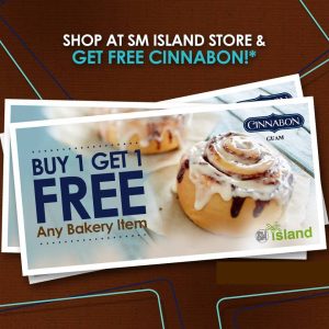 With EVERY Purchase at SM Island Guam receive a Coupon for Cinnabon’s BUY 1 GET 1 FREE Any Bakery Item.
